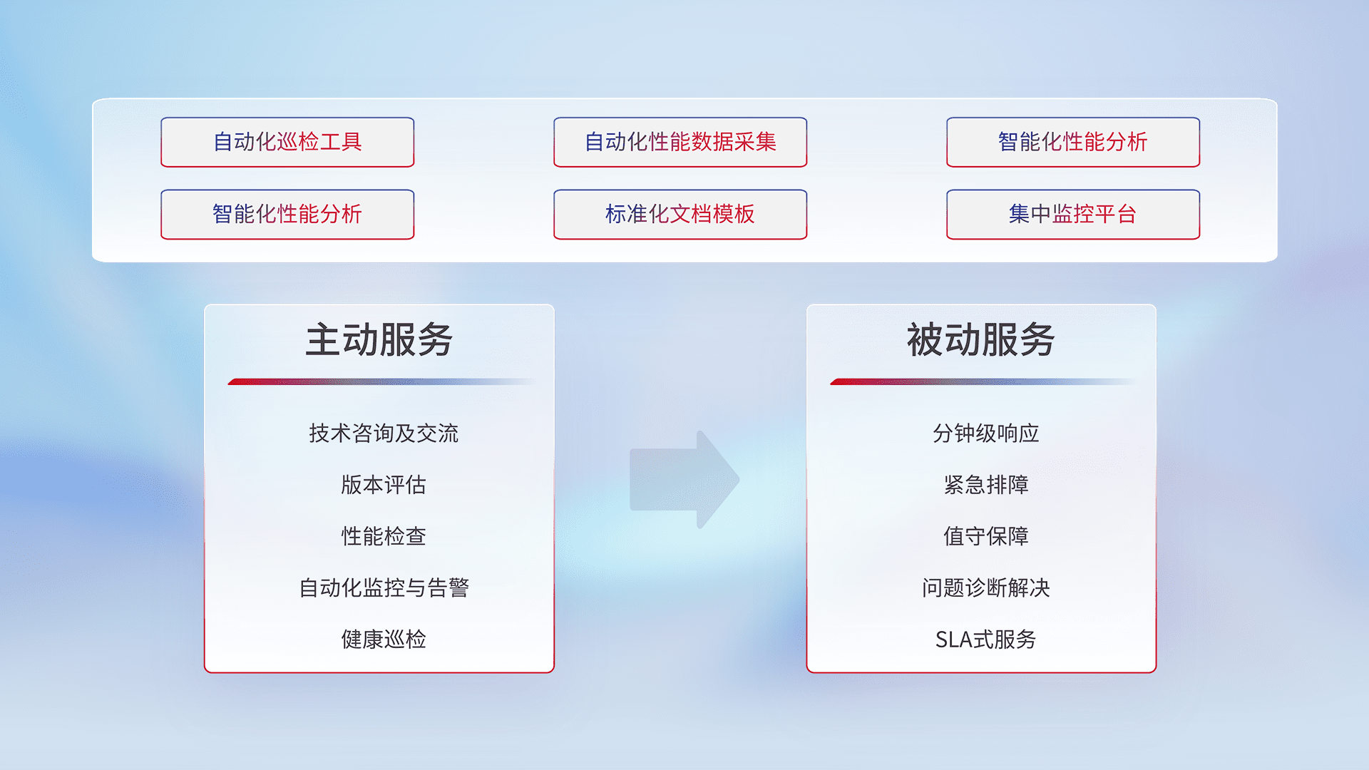 智能化工具和标准化文档,,保障服务质量,,,提供主动服务(包含技术咨询、、、版本评估、、、性能检查、、、、自动化监控与告警、、健康巡检)和被动服务包含(分钟级响应、、、紧急排障、、值守保障、、、、问题诊断解决、、SLA服务)。。。。