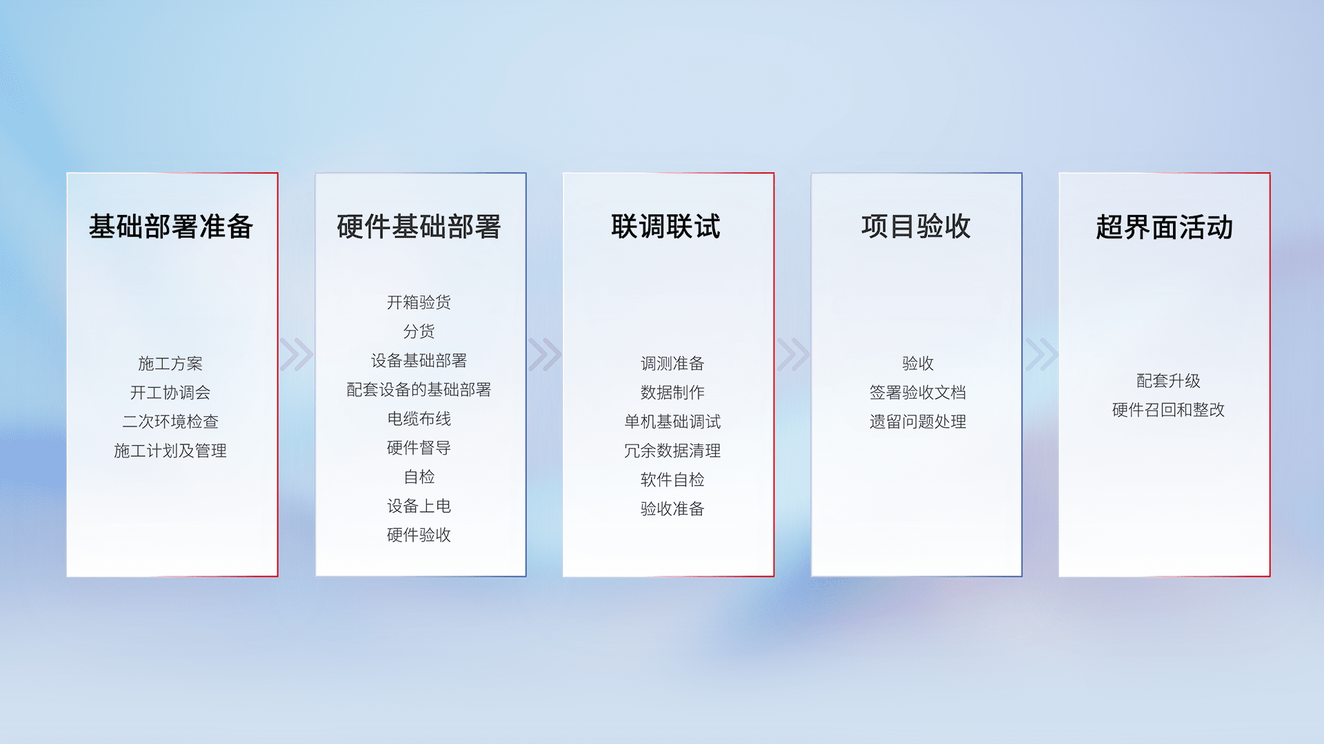 从基础部署准备、、、硬件基础部署、、联调联试、、项目验收、、越界面活动的全过程可追溯,,保证施工质量和进度。。。
